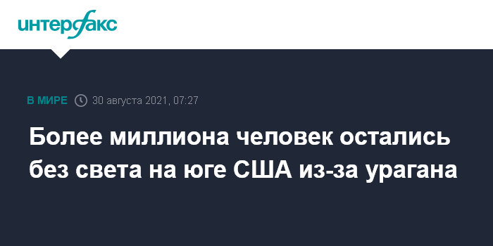 Москва. 30 августа. INTERFAX.RU - Более миллиона человек остались без электричества из-за урагана "Ида", обрушившегося на американский штат Луизиана в воскресенье, следует из данных сервиса PowerOutrage.US, отслеживающего сбои в электроснабжении в США.