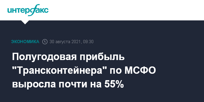 Москва. 30 августа. INTERFAX.RU - В I полугодии 2021 года чистая прибыль "Трансконтейнера" по МСФО выросла на 54,8% в годовом измерении, до 9,204 млрд рублей, говорится в отчете компании.