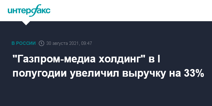 Москва. 30 августа. INTERFAX.RU - В I полугодии "Газпром-медиа холдинг" с "дочками" увеличил выручку в годовом измерении на 33%, до до 56,9 млрд рублей, и получил 5,7 млрд рублей чистой прибыли, говорится в отчете холдинга.