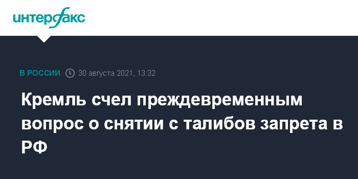 Москва. 30 августа. INTERFAX.RU - Пока преждевременно говорить о снятии с движения "Талибан" статуса запрещенной в России террористической организации, сначала надо посмотреть на первые шаги талибов в руководстве Афганистана, заявил пресс-секретарь президента РФ Дмитрий Песков.