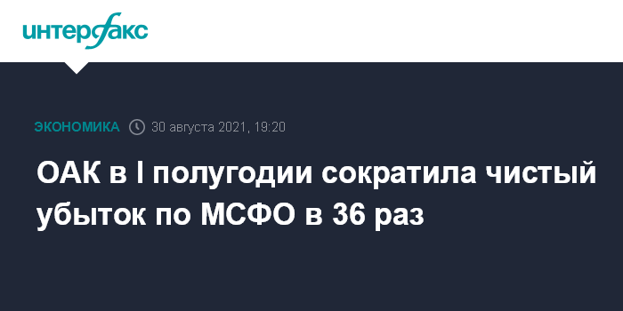 Москва. 30 августа. INTERFAX.RU - ПАО "Объединенная авиастроительная корпорация" (ОАК) в I полугодии 2021 года сократило чистый убыток по МСФО почти в 36 раз относительно того же периода прошлого года, до 976 млн руб., следует из отчетности компании.