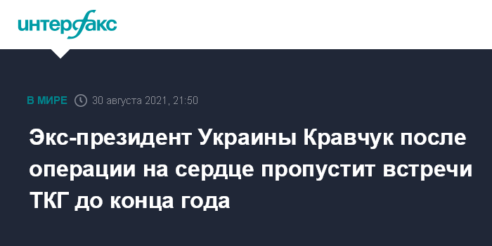 Москва. 30 августа. INTERFAX.RU - Глава украинской делегации Леонид Кравчук, скорее всего, не примет участие в работе Трехсторонней контактной группы (ТРКГ) по Донбассу до ноября-декабря 2021 года, сообщил спикер украинской делегации в ТКГ Алексей Арестович.