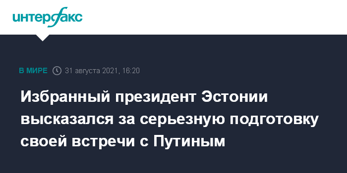 Москва. 31 августа. INTERFAX.RU - Избранный президентом Эстонии Алар Карис (Alar Karis) высказал мнение, что встреча с главой российского государства Владимиром Путиным будет полезной, но к ней нужно серьезно подготовиться.