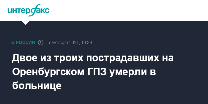 Москва. 1 сентября. INTERFAX.RU - В Оренбурге умерли двое из троих рабочих, которые получили ожоги при пожаре 25 августа на Оренбургском газоперерабатывающем заводе (ГПЗ). Как уточнили "Интерфаксу" в областном управлении СК, они умерли 30 и 31 августа в больнице, третий пострадавший находится в тяжелом состоянии.
