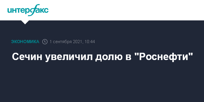 Москва. 1 сентября. INTERFAX.RU - Глава "Роснефти" Игорь Сечин увеличил долю в компании с 0,1273% до 0,1288%, говорится в сообщении НК.