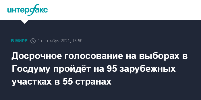 Москва. 1 сентября. INTERFAX.RU - Центризбирком России в среду утвердил список избирательных участков, расположенных за пределами страны, на которых пройдет досрочное голосование в рамках предстоящих парламентских выборов - всего такое голосование предусмотрено на 95 зарубежных избирательных участках в 55 странах.
