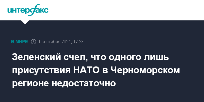 Москва. 1 сентября. INTERFAX.RU - Президент Украины Владимир Зеленский поблагодарил блок НАТО за поддержку и присутствие в Черноморском регионе, однако считает, что в нынешних условиях этого недостаточно.