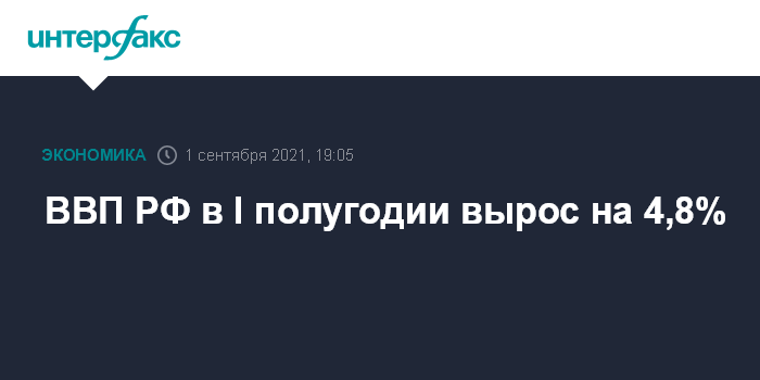 Москва. 1 сентября. INTERFAX.RU - ВВП РФ в I полугодии 2021 года вырос по сравнению с аналогичным периодом прошлого года на 4,8%. Такую оценку распространила в среду Федеральная служба государственной статистики (Росстат).