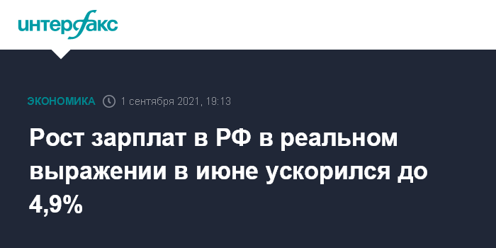 Москва. 1 сентября. INTERFAX.RU - Рост реального размера (с поправкой на инфляцию) заработной платы в РФ в июне 2021 года составил 4,9% в годовом выражении после повышения на 3,3% в мае, на 7,8% в апреле, на 1,8% в марте, на 2% в феврале и на 0,1% в январе, сообщил в среду Росстат.