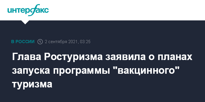 Москва. 2 сентября. INTERFAX.RU - Глава Ростуризма Зарина Догузова заявила, что в этом году планируется запустить программу "вакцинный" туризм для вакцинации иностранцев.