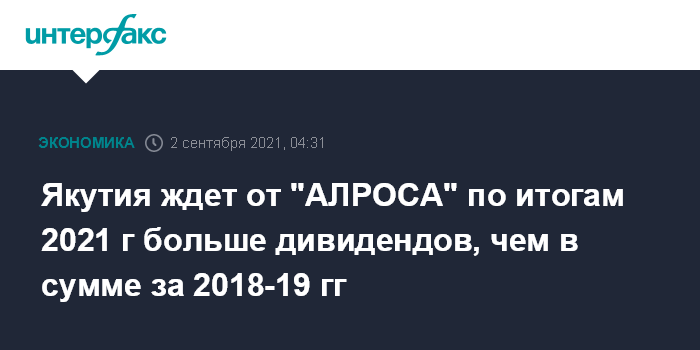 Москва. 2 сентября. INTERFAX.RU - "АЛРОСА" по итогам 2021 года выплатит акционерам больше, чем в сумме за 2018-2019 годы, предшествовавшие пандемии коронавируса, рассчитывает Якутия.