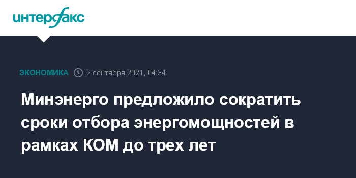Москва. 2 сентября. INTERFAX.RU - Минэнерго предлагает сократить до трех лет сроки отбора энергообъектов в рамках конкурентного отбора мощности (КОМ) и проектов модернизации тепловой генерации (КОМмод), рассказал замминистра энергетики Павел Сниккарс журналистам в кулуарах ВЭФ-2021.