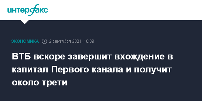 Москва. 2 сентября. INTERFAX.RU - ВТБ в ближайшее время завершит вхождение в капитал Первого канала, получив треть его акций, сообщил журналистам глава банка Андрей Костин.