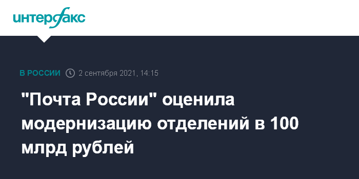 Москва. 2 сентября. INTERFAX.RU - АО "Почта России" оценивает стоимость пятилетней программы модернизации отделений примерно в 100 млрд рублей, сообщил журналистам в кулуарах ВЭФ-2021 глава компании Максим Акимов.