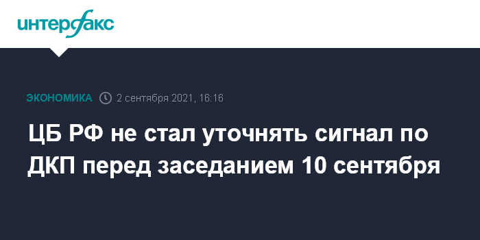 Москва. 2 сентября. INTERFAX.RU - Банк России не стал уточнять сигнал по денежно-кредитной политике (ДКП) перед заседанием совета директоров 10 сентября, отметив актуальность июльского сигнала.