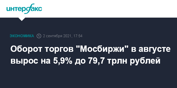 Москва. 2 сентября. INTERFAX.RU - Общий объем торгов на рынках "Московской биржи" в августе 2021 года вырос на 5,9% по сравнению с августом 2020 года и составил 79,7 трлн рублей, говорится в сообщении торговой площадки.
