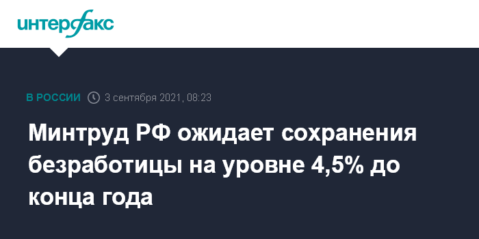 Москва. 3 сентября. INTERFAX.RU - Глава Минтруда РФ Антон Котяков сообщил, что уровень безработицы в РФ останется на уровне 4,5% до конца текущего года.