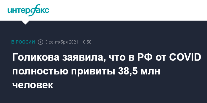"Сегодня количество вакцинированных взрослых людей в РФ - 45,4 млн человек, которые привились по одному разу, и где-то 38,5 млн - это полностью привитых", - сказала Голикова на марафоне "Новое знание" в пятницу.