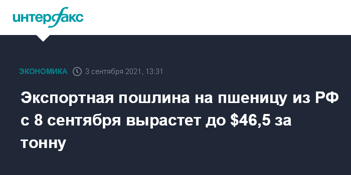 Москва. 3 сентября. INTERFAX.RU - Экспортная пошлина на пшеницу с 8 сентября повысится с $39,4 (эта ставка действует с 1 по 7 сентября) до $46,5 за тонну, следует из данных Минсельхоза РФ.