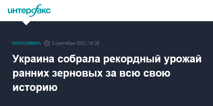 Москва. 3 сентября. INTERFAX.RU - Украина завершила сбор ранних зерновых и зернобобовых культур. С общей площади 10,2 млн га собран рекордный за всю историю страны урожай – 44,8 млн тонн. Об этом сообщило министерство аграрной политики и продовольствия.