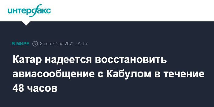 Москва. 3 сентября. INTERFAX.RU - Специальный посланник Катара Мутлак ибн Маджид Аль-Кахтани заявил, что в течение 48 часов Катар надеется восстановить воздушное сообщение с аэропортом Кабула для доставки гуманитарной помощи в страну, сообщает в пятницу "Аль-Джазира".