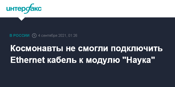 Москва. 4 сентября. INTERFAX.RU - Космонавтам Олегу Новицкому и Петру Дуброву не удалось подключить к модулю "Наука" Ethernet кабель, сообщили в NASA.