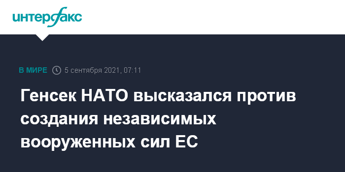 Москва. 5 сентября. INTERFAX.RU - Формирование в Европе независимых от США вооруженных сил приведет к расколу среди союзников по НАТО, заявил генеральный секретарь Североатлантического альянса Йенс Столтенберг в интервью The Telegraph.