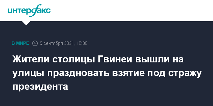 Москва. 5 сентября. INTERFAX.RU - Жители столицы Гвинеи, Конакри, вышли на улицы, чтобы выразить радость по поводу задержания мятежными бойцами армейского спецназа президента страны Альфы Конде, сообщает в воскресенье информационный портал Guinee Matin.