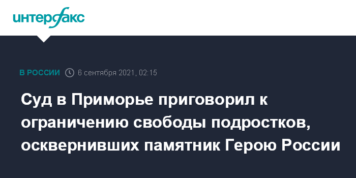 Москва. 6 сентября. INTERFAX.RU - Суд в Приморье приговорил к ограничению свободы двух девочек-подростков за осквернение памятника погибшему в Сирии Герою России Олегу Пешкову, сообщила прокуратура региона.