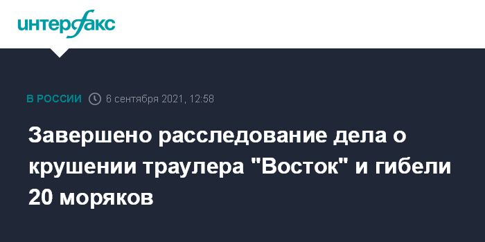 Москва. 6 сентября. INTERFAX.RU - Завершено расследование гибели 20 моряков при крушении траулера "Восток" в 2018 году в Японском море, единственный обвиняемый - замглавы ООО "ДВ-Флот" Андрей Клочков, сообщила официальный представитель следственного комитета (СК) Светлана Петренко.