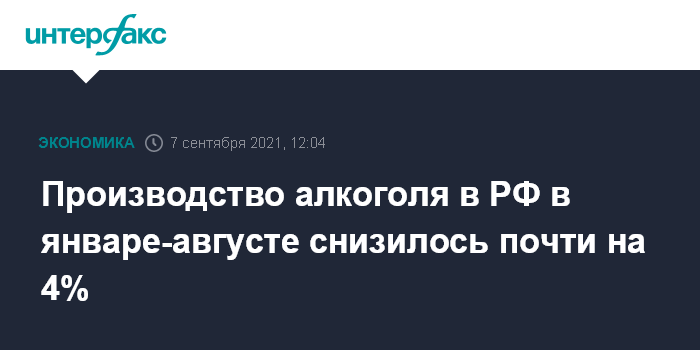 Москва. 7 сентября. INTERFAX.RU - Производство алкогольной продукции (без пива, напитков, изготовляемых на основе пива, сидра, пуаре и медовухи) в январе-августе этого года в РФ составило 105,47 млн декалитров (дал), что на 3,8% меньше, чем за аналогичный период прошлого года. Об этом сообщает Национальный союз защиты прав потребителей.