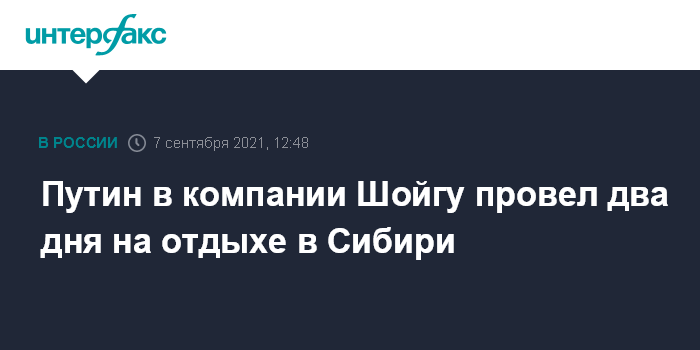 Москва. 7 сентября. INTERFAX.RU - Президент РФ Владимир Путин пару дней отдохнул в Сибири, компанию ему составил министр обороны Сергей Шойгу, сообщил пресс-секретарь президента Дмитрий Песков.