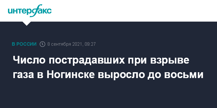 Москва. 8 сентября. INTERFAX.RU - По последним данным, восемь человек пострадали при взрыве газа в девятиэтажном доме в Ногинске.
