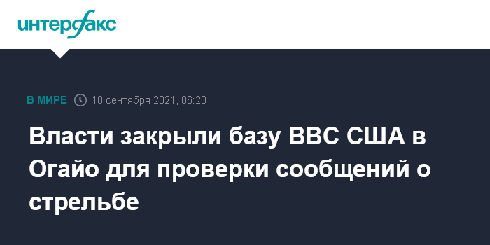 Москва. 10 сентября. INTERFAX.RU - База американских ВВС "Райт-Паттерсон" в американском штате Огайо закрыта после сообщений о стрельбе на ее территории, сообщило командование 88-го крыла авиабазы в твиттере.