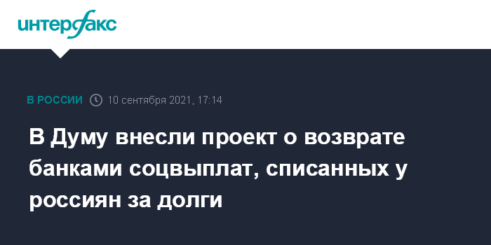 Москва. 10 сентября. INTERFAX.RU - Группа депутатов и сенаторов внесла в парламент законопроект, который вводит для граждан механизм возврата списанных банком с их счетов средств для погашения кредитов, если данные средства можно отнести к категории единовременной социальной поддержки. Банки также должны будут вернуть данные "социальные" средства, списанные ими с 1 января 2021 г.
