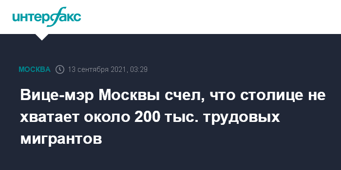 Москва. 13 сентября. INTERFAX.RU - Москва все еще испытывает дефицит трудовых мигрантов на стройках, сейчас не хватает порядка 200 тыс. человек, сообщил вице-мэр Москвы по вопросам экономической политики и имущественно-земельных отношений Владимир Ефимов в интервью, опубликованном в понедельник в газете "Известия".