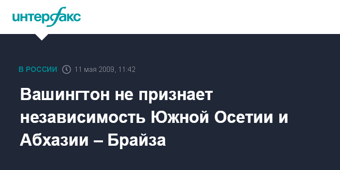 Москва. 11 мая. INTERFAX.RU - В США "никогда не признают" независимость Южной Осетии и Абхазии, заявил радиостанции "Эхо Москвы" заместитель помощника госсекретаря по делам Европы и Евразии, американский сопредседатель Минской группы ОБСЕ Мэтью Брайза.
