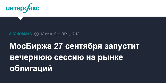 Москва. 13 сентября. INTERFAX.RU - Московская биржа планирует 27 сентября запустить вечерние торги на рынке облигаций с 19:00 до 23:50 по Москве, рассказал журналистам директор департамента долгового рынка МосБиржи Глеб Шевеленков.