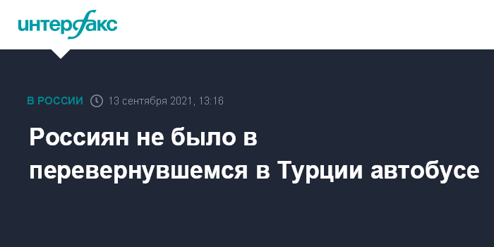 Москва. 13 сентября. INTERFAX.RU - В туристическом автобусе, попавшем в ДТП на трассе Мугла-Денизли в Турции, не было граждан РФ, причины аварии устанавливаются, сообщили "Интерфаксу" в Генконсульстве РФ в Анталье.