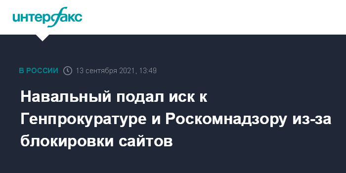 Москва. 13 сентября. INTERFAX.RU - Тверской суд Москвы зарегистрировал иск Алексея Навального к Генеральной прокуратуре РФ и Роскомнадзору об оспаривании решений и действий органов государственной власти, сообщили "Интерфаксу" в суде.