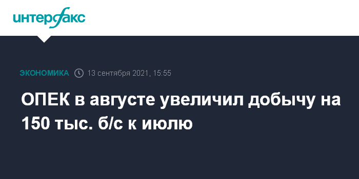 ОПЕК в августе увеличил добычу на 150 тыс. б/с к июлю