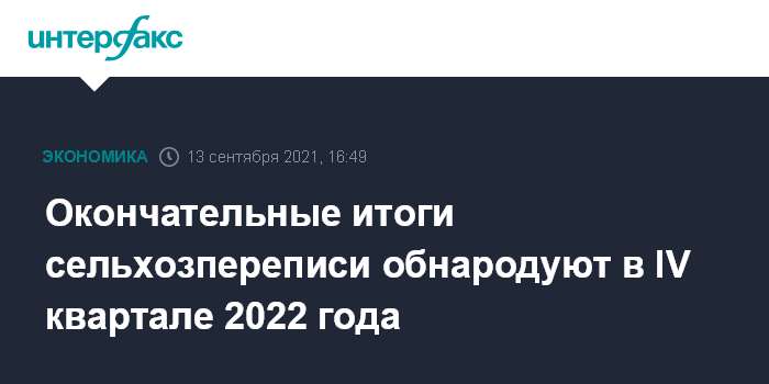 Москва. 13 сентября. INTERFAX.RU - Росстат опубликует окончательные итоги сельскохозяйственной микропереписи в четвертом квартале 2022 года, пока ведомство продолжает консолидацию собранных данных.