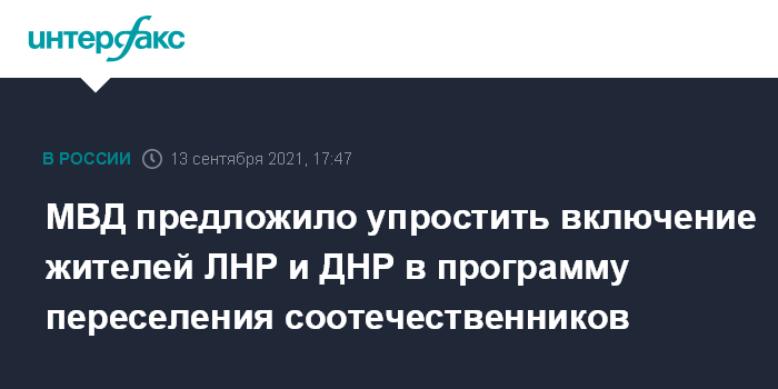 Москва. 13 сентября. INTERFAX.RU - В министерстве внутренних дел России предлагают разрешить жителям самопровозглашенных республик Донбасса вступать в Государственную программу по оказанию содействия добровольному переселению проживающих соотечественников на территории России.