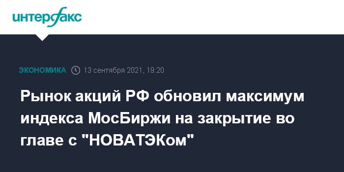Москва. 13 сентября. INTERFAX.RU - Рынок акций РФ завершил торги уверенным ростом на фоне позитивной динамики внешних фондовых и сырьевых площадок; индекс МосБиржи обновил исторический максимум на закрытие торгов во главе с также обновившими пики бумагами "НОВАТЭКа" благодаря раллирующим ценам на газ.