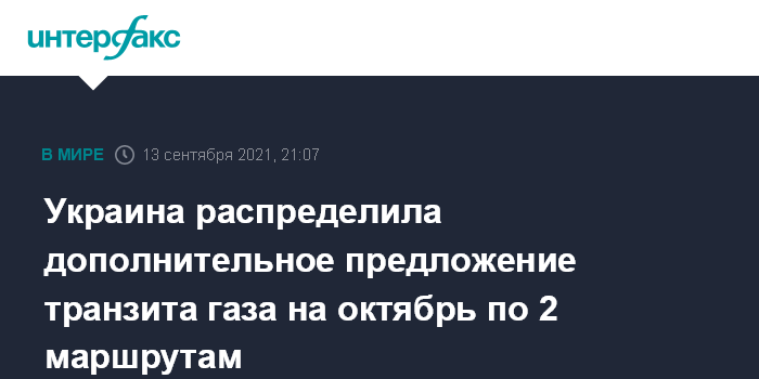 Москва. 13 сентября. INTERFAX.RU - "Оператор газотранспортной системы Украины" выставил на аукцион на платформе бронирования Regional Booking Platform 20 сентября дополнительные твердые транзитные мощности на октябрь в размере 15 млн куб. м в сутки, как и в предыдущие месяцы, свидетельствуют данные RBP.