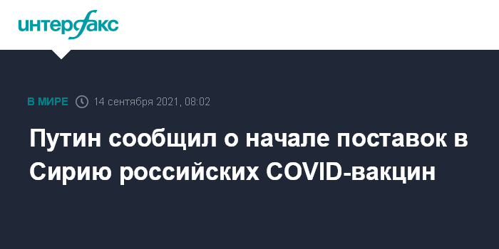 Москва. 14 сентября. INTERFAX.RU - Поставки российской вакцины от коронавируса "Спутник V" и "Спутник Лайт" начались в Сирию, сообщил президент РФ Владимир Путин.