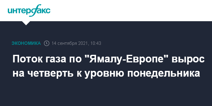 Москва. 14 сентября. INTERFAX.RU - Утром во вторник 14 сентября физический поток газа по газопроводу "Ямал-Европа" на входе в газотранспортную систему ФРГ утром во вторник увеличился на четверть к уровню понедельника, показали данные германского газотранспортного оператора Gascade.