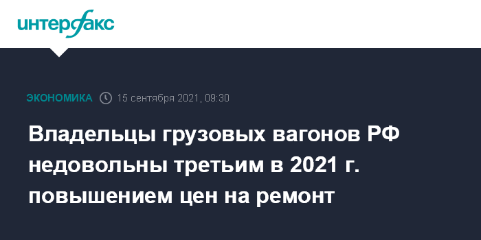 Москва. 15 сентября. INTERFAX.RU - Вагоноремонтные компании (ВРК) намерены с 1 октября в третий раз с начала 2021 года повысить стоимость своих услуг, пишут в среду "Ведомости" со ссылкой на представителя Союза операторов железнодорожного транспорта (СОЖТ, объединяет крупнейших собственников грузовых вагонов).