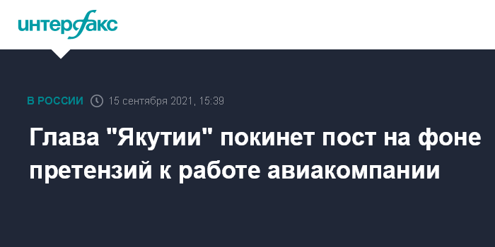 Москва. 15 сентября. INTERFAX.RU - Гендиректор авиакомпании "Якутия" Владимир Горубнов оставит этот пост после рабочей встречи с министром транспорта Якутии Владимиром Сивцовым, сообщила пресс-служба регионального Минтранса. Он уже подал чиновнику заявление об уходе.