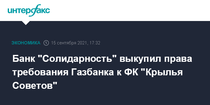 Москва. 15 сентября. INTERFAX.RU - Банк "Солидарность" на аукционе выкупил права требования обанкротившегося Газбанка к футбольному клубу (ПФК) "Крылья Советов", сообщил организатор торгов - Российский аукционный дом (РАД).